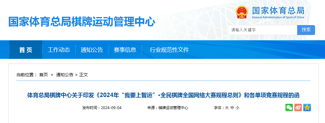 体育总局棋牌中心关于印发《2024年“我要上智运”?全民棋牌全国网络大赛规程总则》和各单项竞赛规程的函