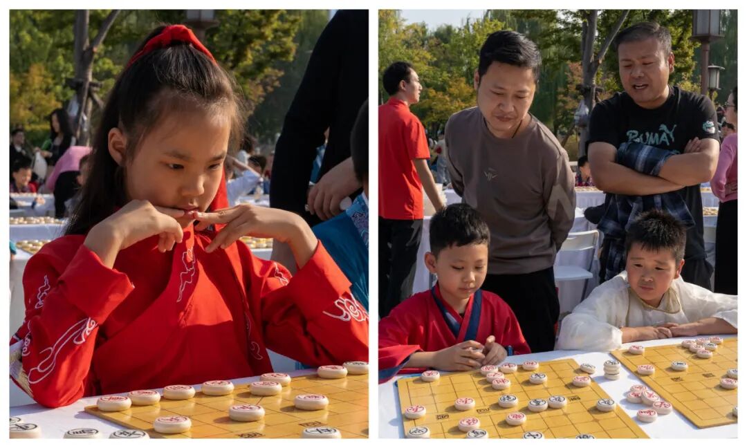 棋盘之上,楚河汉界分明,棋迷们或全神贯注,或蹙眉思考,整个明圣宫内弥漫着浓厚的文化气息与竞技热情。在这里,他们不仅与特级大师切磋了棋艺,更在“一子定天下”的豪迈中,感受到了象棋作为国粹的独特魅力。小雁塔坐落于西安博物院内,是为存放唐代高僧义净从天竺带回来的佛教经卷、佛图而建,是唐长安城保留至今的重要标志之一。活动当天,小雁塔景区内人头攒动,热闹非凡。西安市碑林区文化和旅游体育局局长徐琳、副局长杨念军、陕西省象棋协会秘书长田丽萍等领导出席了活动的开幕式。西安小天鹅艺术团、碑林区实验小学的小演员们带来的象棋舞蹈拉开了活动的序幕。孩子们身着古代服饰,手持象棋棋子,以优美的舞姿伴着欢快的节奏,将象棋的智慧与魅力展现得淋漓尽致。他们的精彩表演吸引了景区内的诸多游客驻足观看,几位外国游客也被现场浓厚的中国传统文化氛围所吸引。在阵阵掌声中,活动的气氛被推向高潮。来自上海的游客张先生兴奋地表示:“我一直对西安的历史文化充满向往,今天又亲眼看到象棋特级大师与小棋手对弈,真是太幸运了。这是我第一次近距离接触象棋主题活动,在这样浓厚的历史文化氛围下,看到孩子们穿着汉服,那么专注地下棋,让我感觉穿越回了古代。等我的孩子大一些后我也会让他学象棋。”小雁塔下,特级大师党国蕾、陈幸琳、刘欢分别与20名小棋手展开了激烈的对弈。三位特级大师以精湛的棋艺和亲切的感染力,赢得了小棋手们的尊敬和喜爱。身着中国传统服饰的小棋手们时而眉头紧锁,时而喜笑颜开,全神贯注地投入到每一局棋中。小棋手身后的家长也全情投入地为他们出谋划策,温馨而紧张的气氛下,象棋成为了拉近亲子关系的纽带。