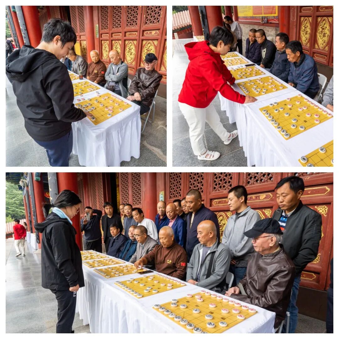 象棋与道教的文化碰撞在西安早有先例,西安市区内的都城隍庙是西安近年来象棋文化活动的重要舞台。在这里举办的都城隍庙象棋擂台赛是当地棋迷一年一度的节日。坐落于骊山之巅的明圣宫与都城隍庙遥相呼应,同样是集道教文化、古建筑艺术与自然景观于一体的文化瑰宝。党国蕾、陈幸琳、刘欢三位特级大师在古色古香的宫殿之间,与来自陕西各地的棋迷进行了车轮战切磋。 虽然活动当天天公不作美,下起了雨,但依然不能阻挡陕西棋迷的热情。由于场地空间限制,参加这次活动的名额有限,成功报名的棋迷非常珍惜这次难得的机会,为了一睹特级大师的风采,有棋迷甚至专程从一百多公里外的城市赶来西安,现场参加活动年龄最大的老棋迷已达83岁高龄。