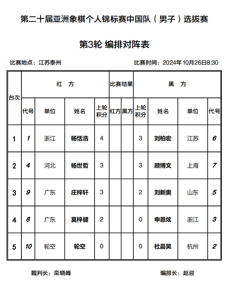 10月25日,第20届亚洲象棋个人锦标赛中国队(男子)选拔赛在江苏省泰州市医药高新区(高港区)开赛。