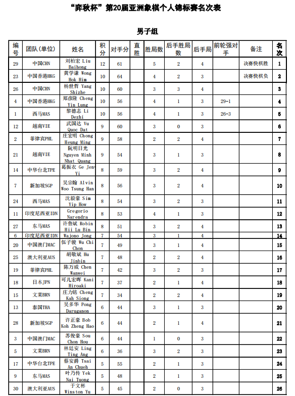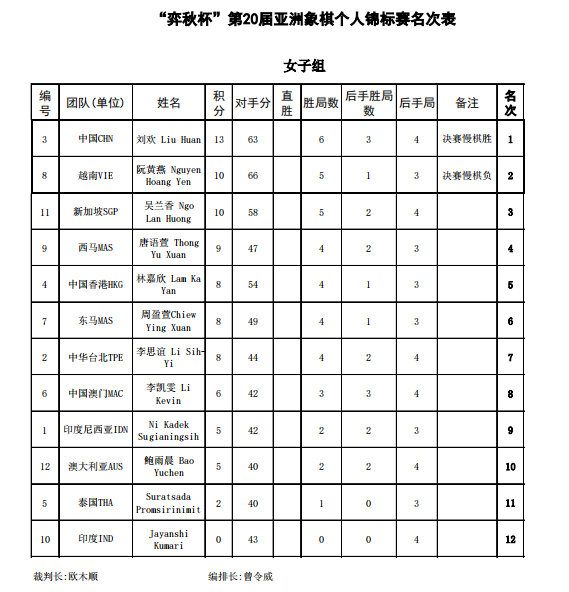 第20届亚洲象棋个人锦标赛在新加坡圆满落幕,中国队刘柏宏、刘欢分获男女冠军