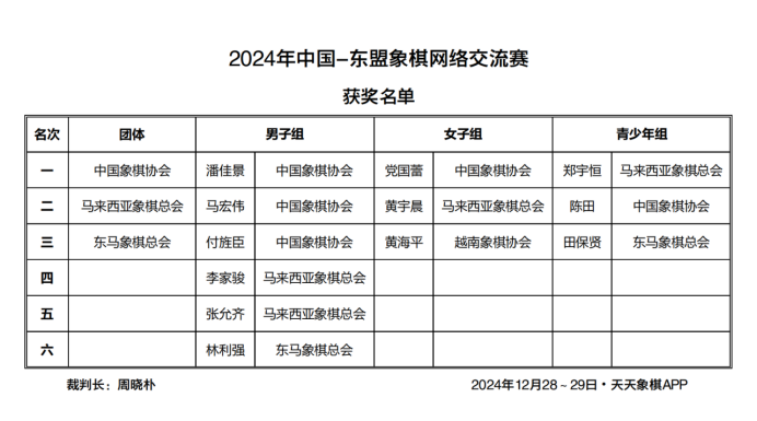 北京时间12月29日下午,为期两天的2024中国-东盟象棋网络交流赛在经历7轮争夺后,落下帷幕。本次比赛通过“天天象棋APP”进行,设置团体、男子、女子、青少年四个项目,来自中国象棋协会、马来西亚象棋总会、东马象棋总会、越南象棋协会、柬埔寨象棋协会、文莱象棋公会6支队伍的27名运动员参赛。