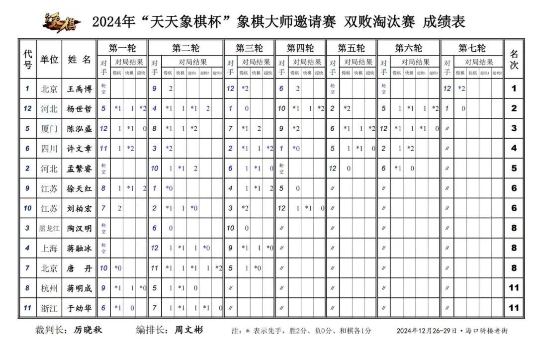 2024年“天天象棋杯”象棋大师邀请赛于12月18日至29日在海南省海口骑楼老街成功举办。本次赛事由腾讯主办,赛事奖金规模高,选手覆盖面广,吸引广大象棋爱好者关注。